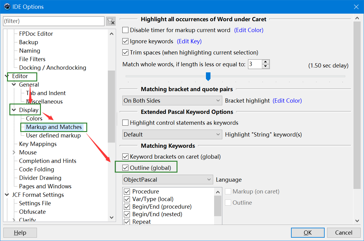lazarus默认没开启代码结构匹配连线功能,开启步骤: